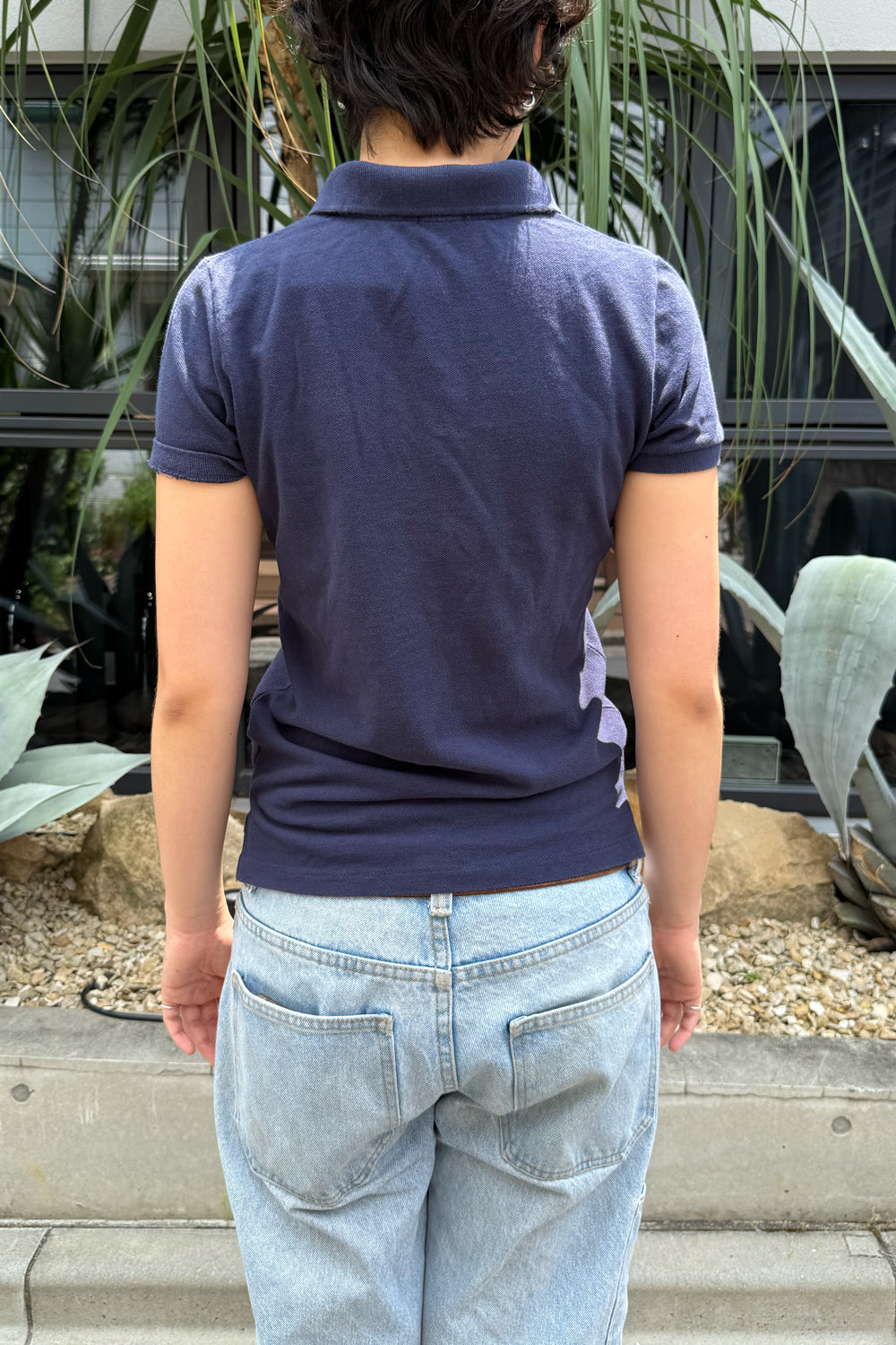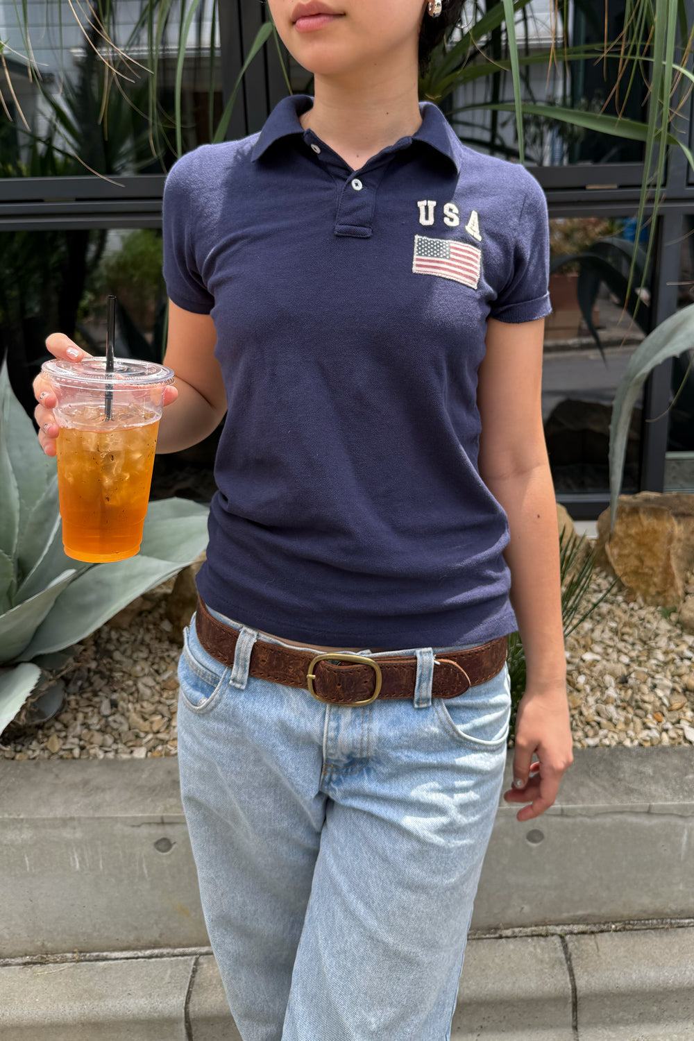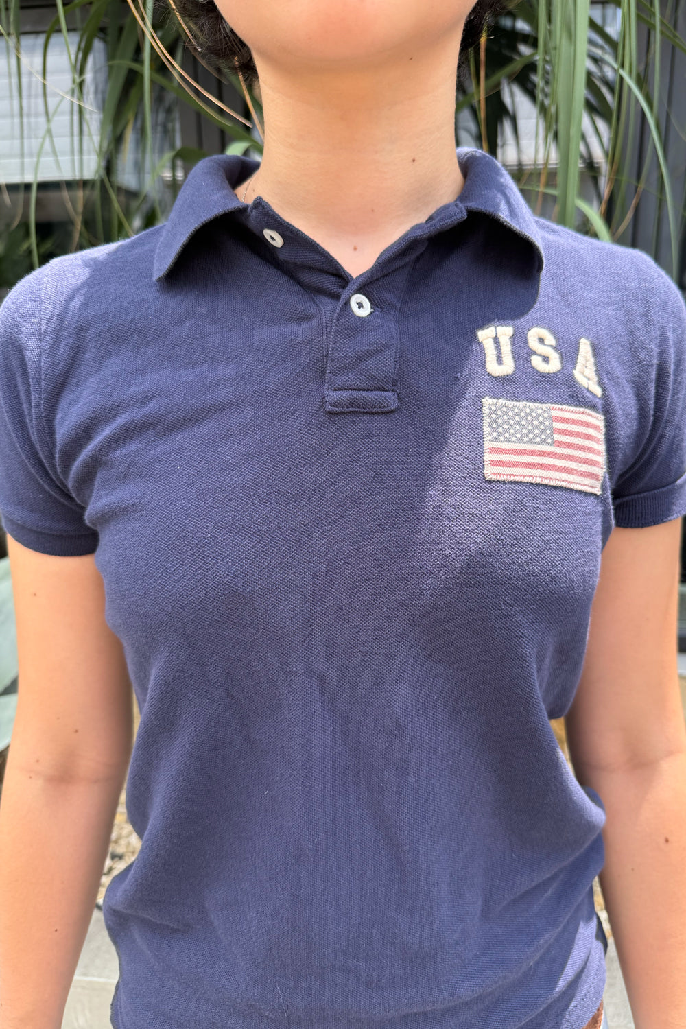 Product Photo - Description of the product. Comfortable polo shirt in navy featuring buttons and "USA Flag" embroidery on left chest.