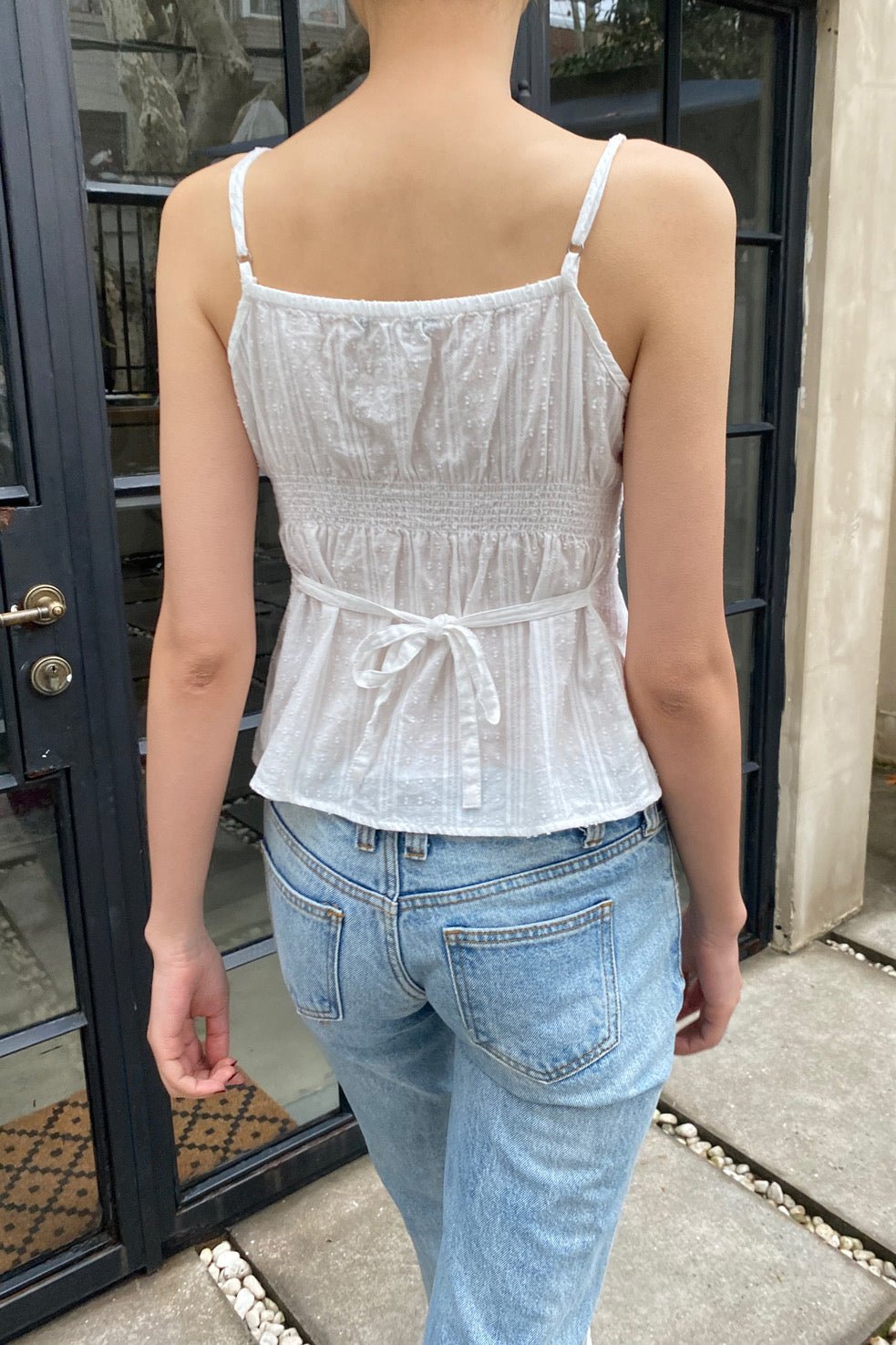 Comfortable and lightweight V-neck printed button-front tank top with lace trim at the neckline. Features an elastic band and tie closure at the back, with adjustable shoulder straps.