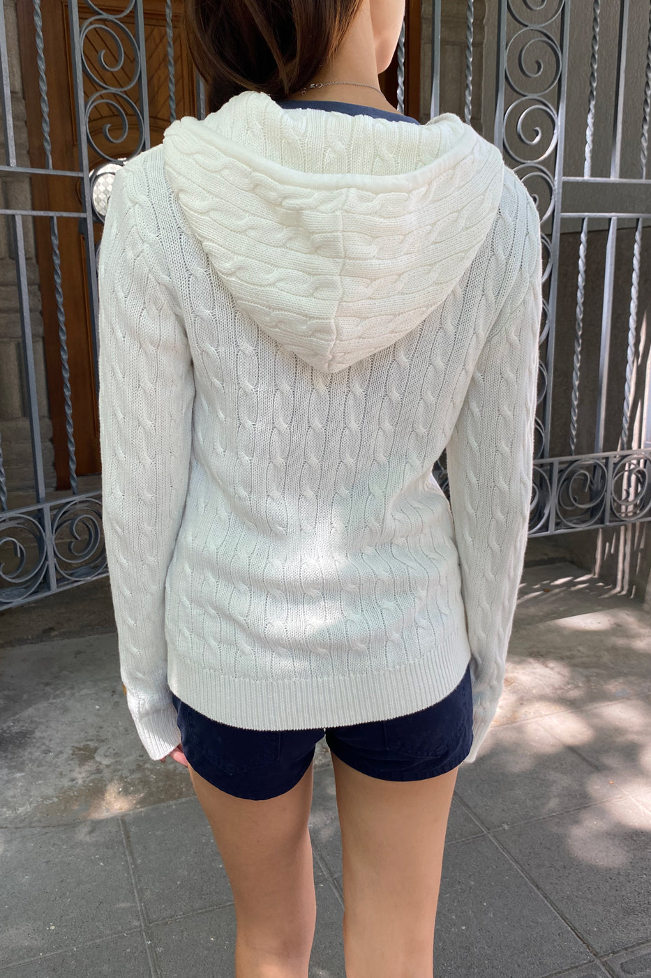 Product Photo - Description of the product. Comfortable cable-knit hooded top with front zipper and kangaroo pockets.Fabric: 60% cotton, 40% acrylicMeasurement: Length: 59cm, Chest: 92cmMade in: China