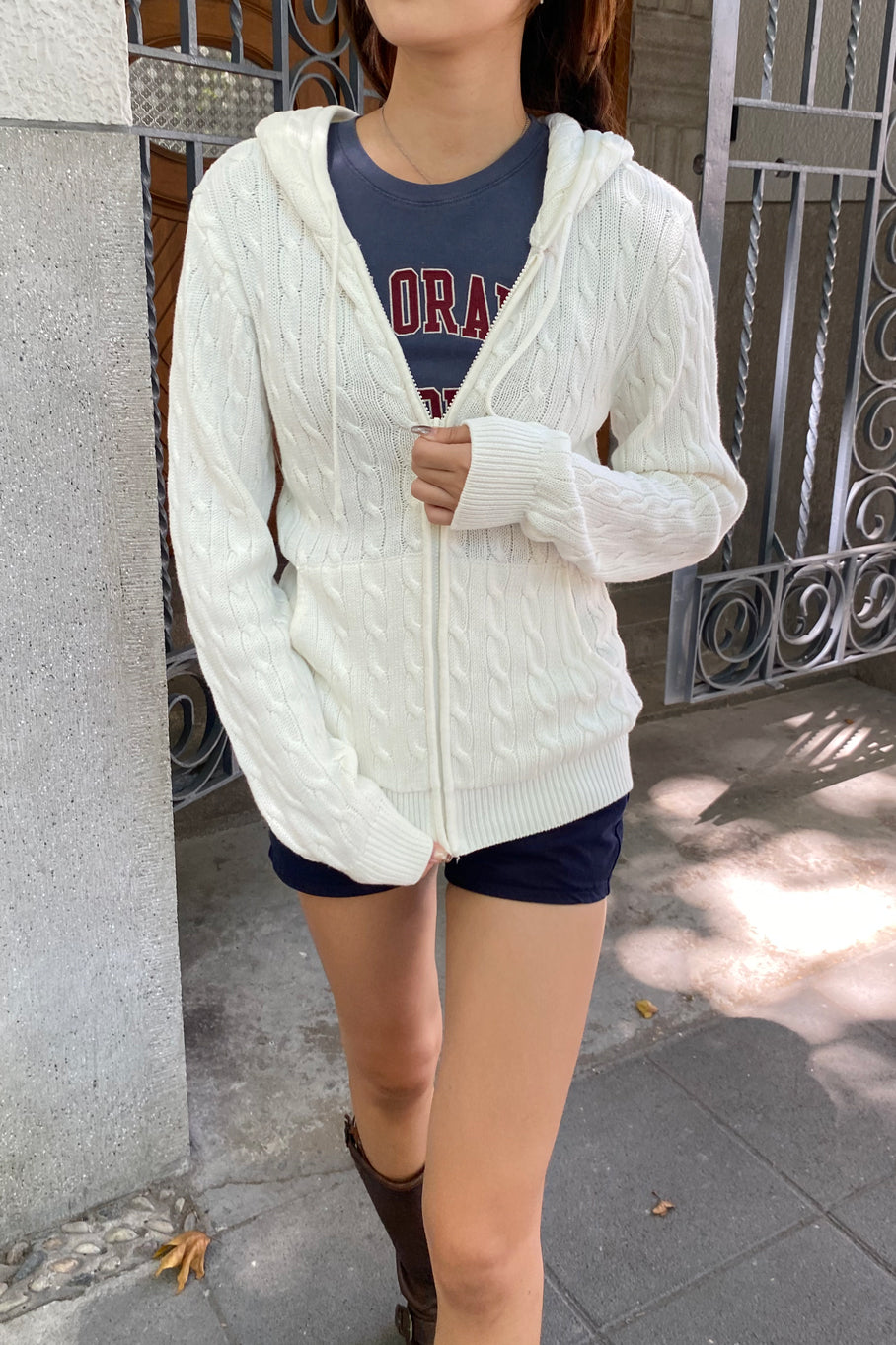 Comfortable cable-knit hooded top with front zipper and kangaroo pockets.